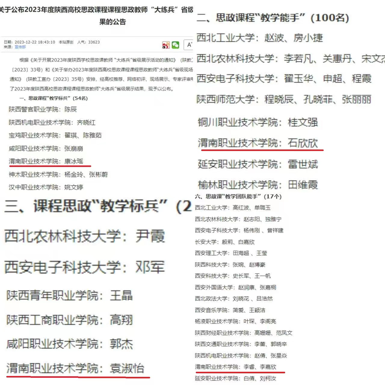 自今年陕西高校思政课程课程思政教师“大练兵”活动开展以来,学院党委高度重视、精心部署,多次从组织保障、教师遴选、教学内容确定等各个环节提出具体地意见和建议。教务处、beat365vip官网登录入口协同发力,在全院范围内开展了思政课程和课程思政教师“大练兵”活动,选拔推荐优秀教师积极备赛。beat365vip官网登录入口凝心聚力、全力以赴,将思政课教师“大练兵”活动作为推动beat365vip官网登录入口内涵建设的有力抓手,从体制机制、过程管理、校内校外、选手之间等方面加强和改善,多次邀请校外专家进校专业指导、联合渭南本地高校集体打磨作品、建立“一对一”打磨指导团队等,对本次成绩的取得起到了重要作用,实现了以赛促练、以赛促训、相互切磋、共同提高的目的。