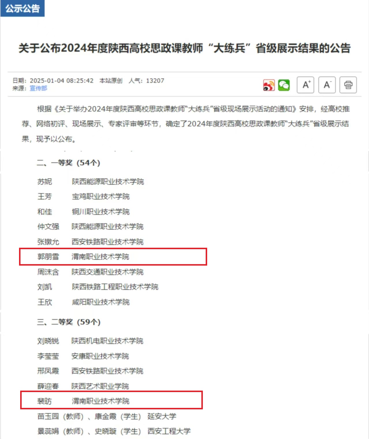2025年1月4日,中共陕西省委教育工委、陕西省教育厅发布了《2024年度陕西高校思政课教师“大练兵”省级展示结果的公告》,beat365vip官网登录入口青年骨干教师郭朋雪喜获一等奖,裴昉荣获二等奖。